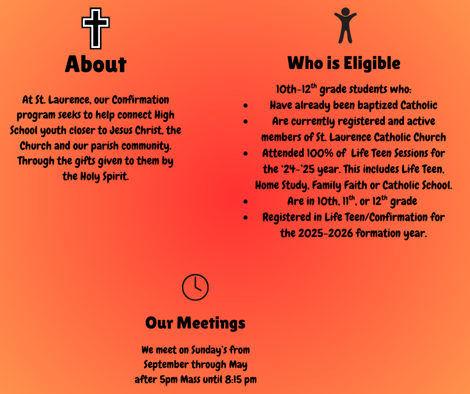 Welcome! We are excited that your teen is interested in receiving the Sacrament of Confirmation! We are excited to journey with you towards this final Sacrament of Initiation.