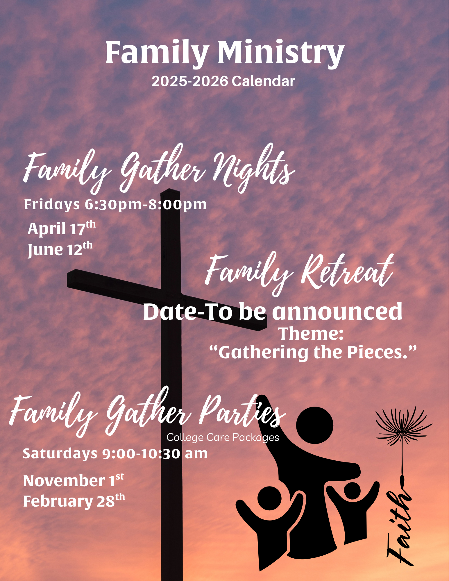 Make your family's spiritual life an adventure. Join us for faith-based, fun filled activities.Sign up using the Sign-up genius link below.