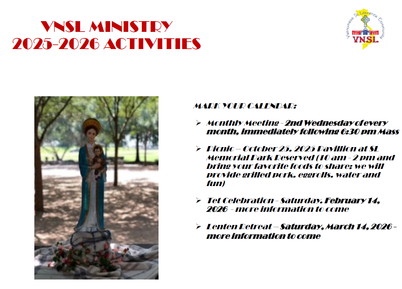 We the Vietnamese Community of St. Laurence "VNSL" are spiritually centered in the culture of strong family faith and values in the love of Christ and live to glorify God in all we do.