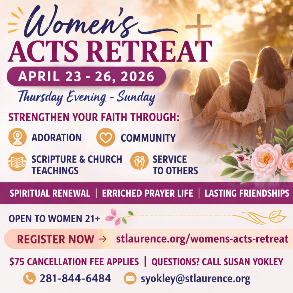 Contact Director - Susan Yokley [email protected] 281-844-6484An ACTS Women's retreat is a four-day retreat beginning on Thursday evening, April 23, and ending on Sunday, April 26, with a luncheon following the 11 am Mass at St. Laurence. This retreat is designed to strengthen your Catholic faith and community by spreading the Gospel of Jesus Christ. The retreat is staffed and run by laywomen. Please prayerfully consider deepening your faith by attending this retreat.